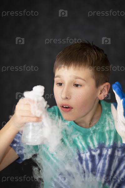 Новые научные открытия. Умный мальчик-ученый кричит от удивления, проводя химические эксперименты в лаборатории. Концепция образования. Открытие
