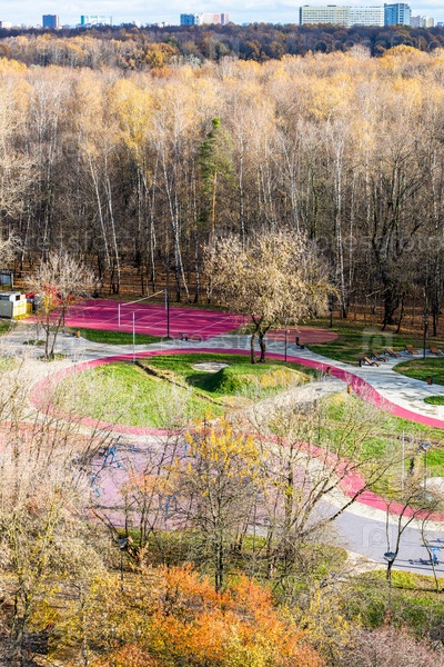Вид с воздуха на спортивную площадку в красочном лесу