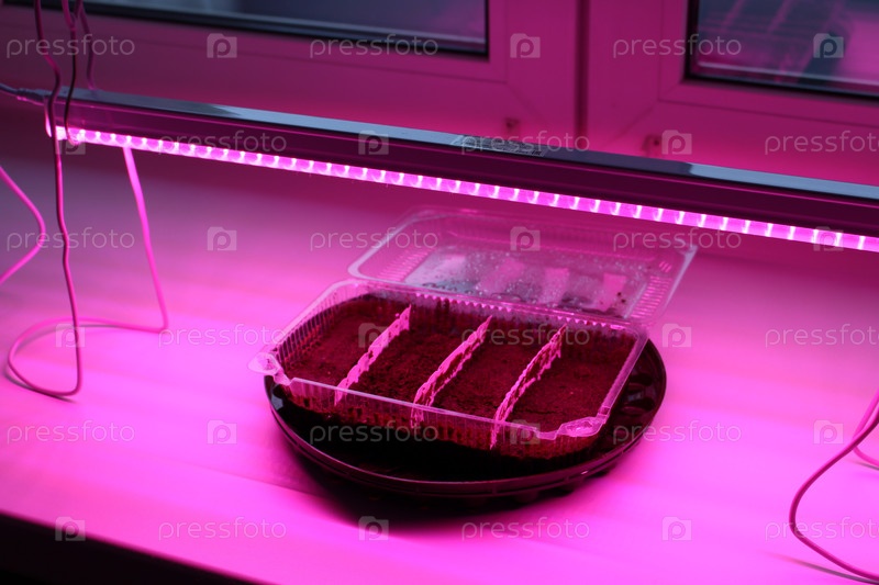 Контейнер с почвой на подоконнике возле окна под лампами для растений