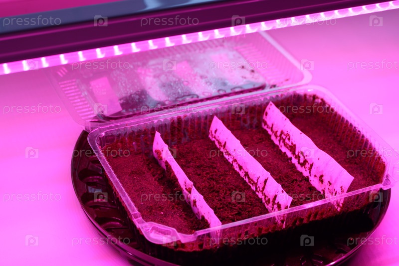 Кокосовая почва в контейнере для проращивания семян под светодиодными розовыми лампами