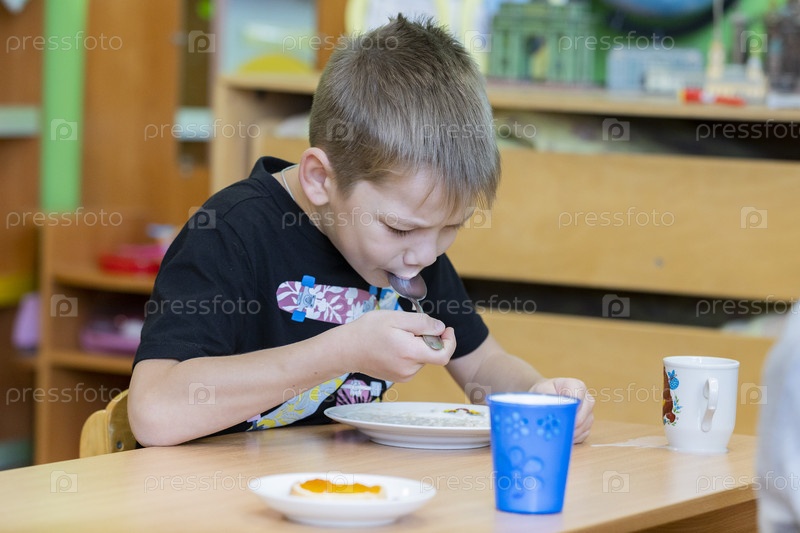 Россия. Санкт-Петербург. Ребенок в детском саду завтракает. Россия. Санкт-Петербург. A child in kindergarten is having breakfast