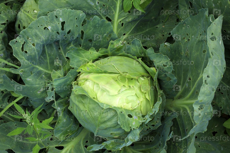 Растущий кочан капусты, поврежденный вредителями - гусеницами капустной белянки и капустной моли