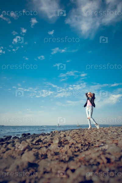 Молодая женщина гуляет по каменистому пляжу, наслаждаясь летними каникулами