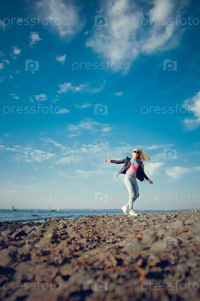 Модель наслаждается свободой и счастьем, гуляя по пляжу
