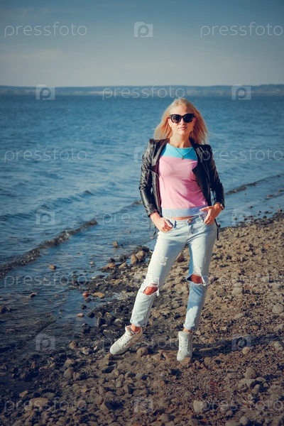 Белокурая модель позирует на галечном пляже в солнцезащитных очках и кожаной куртке