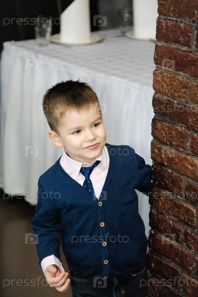 Элегантный ребенок позирует возле кирпичной стены в ресторане