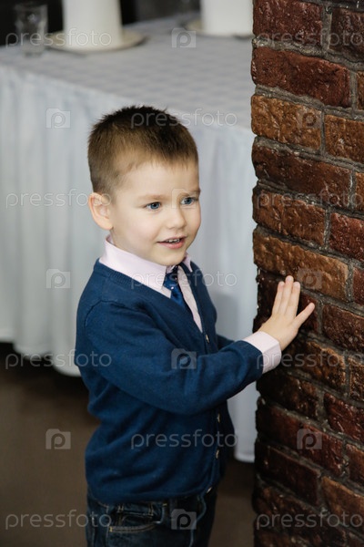 Любопытный ребенок изучает текстуры: малыш в элегантном наряде касается кирпичной стены