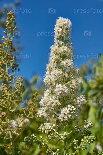 Большой план цветущего соцветия спиреи иволистой на фоне зеленого листа