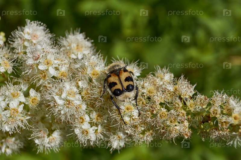 Крупный план жука Trichius fasciatus на цветущем соцветии спиреи иволистой на фоне зеленого листа