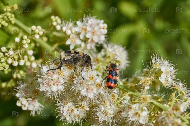 Крупный план жука Trichius fasciatus и жука Trichodes apiarius на цветущем соцветии спиреи слизистой