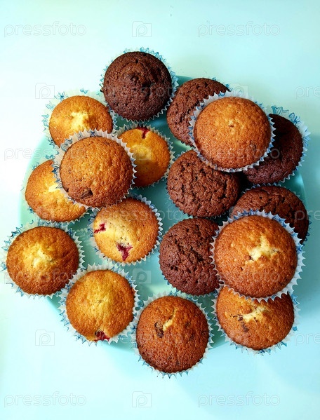 Свежеиспеченные кексы, некоторые с шоколадной крошкой, некоторые с клюквой, на бирюзовой тарелке