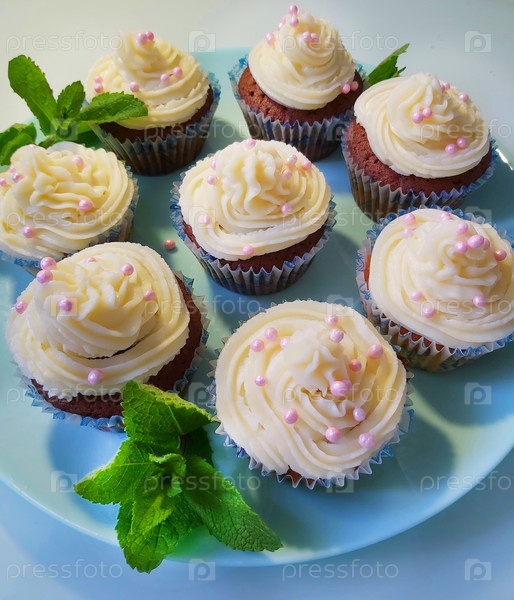 Вкусные домашние кексы, украшенные кремом и розовыми жемчужинами, на светло-голубой тарелке