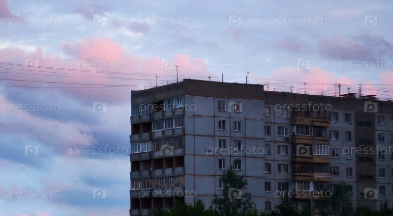 Здание на фоне розового заката