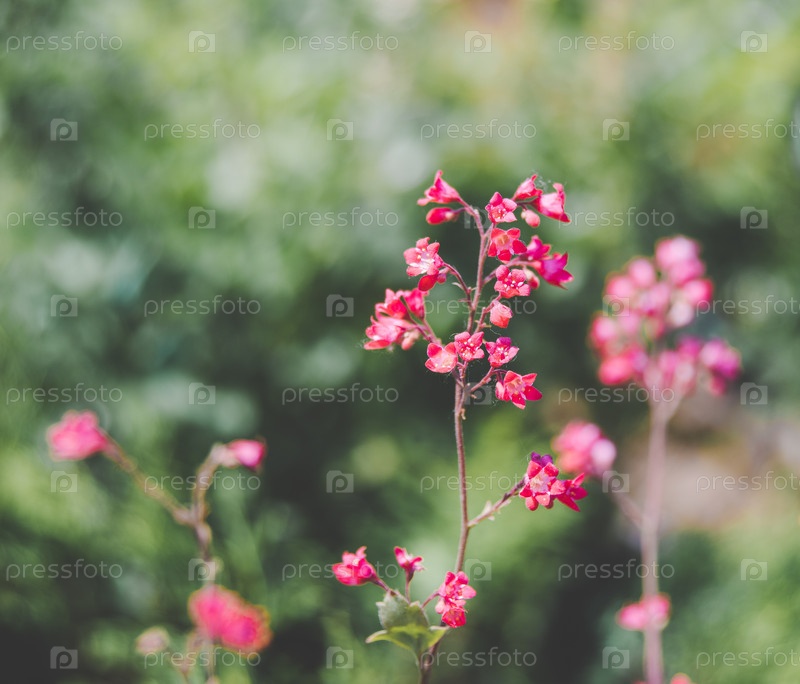 Алая гейхера на фоне зелени