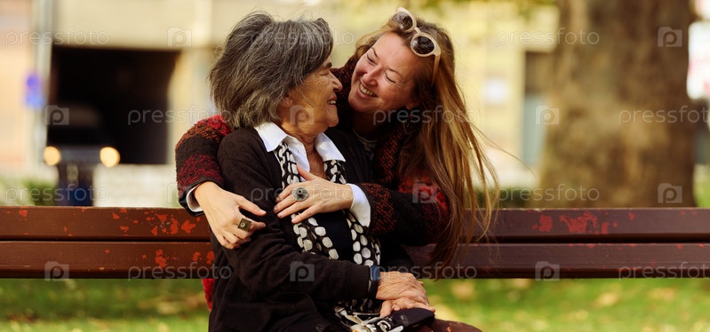 Обнимая поколения: любовь и поддержка дочери для ее пожилой матери в солнечный день в парке