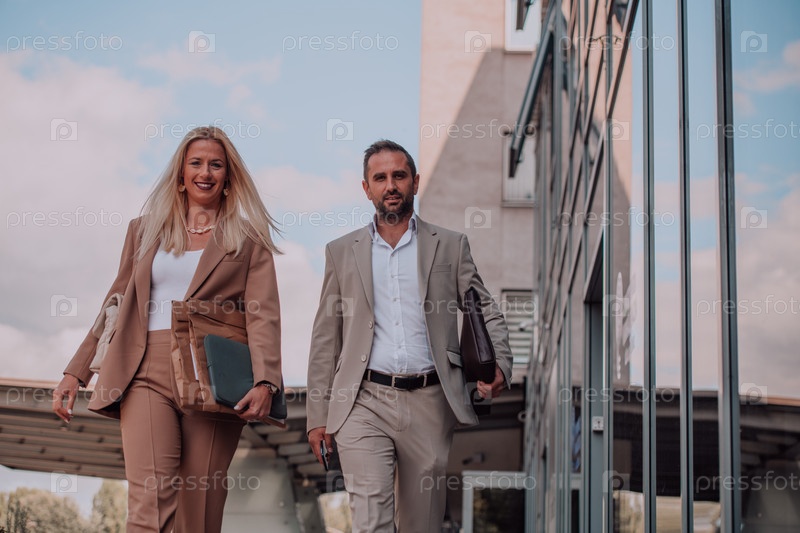 Современная деловая пара после долгого рабочего дня вместе направляется к своему уютному дому, воплощая идеальное сочетание профессионального успеха и личного удовлетворения