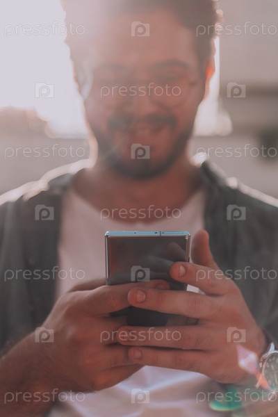 Молодой человек использует свой смартфон на открытом воздухе, демонстрируя органичную интеграцию технологий и мобильности в современную профессиональную жизнь