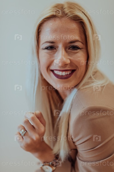 Уверенная в себе и успешная бизнес-леди с широкой улыбкой позирует на бежевом фоне, излучая профессионализм и элегантность
