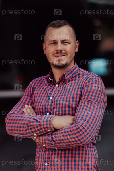Успешный молодой бизнесмен в рубашке, скрестив руки, позирует на открытом воздухе с уверенным выражением лица