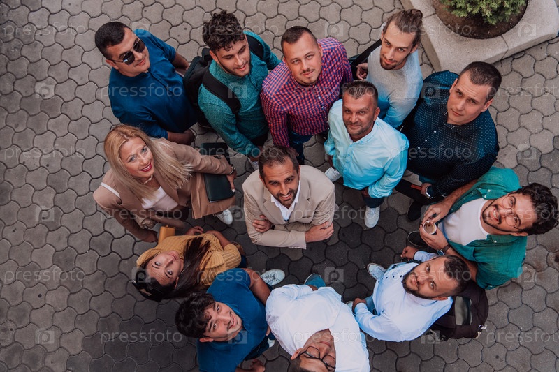 Фотография сверху группы бизнесменов и коллег, стоящих вместе и смотрящих в камеру, символизирующая единство и командную работу