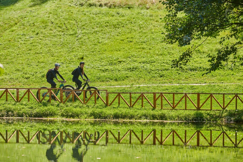 Счастливая пара, одетая в профессиональную велосипедную экипировку, наслаждается романтической велопрогулкой по парку, окруженному современными природными достопримечательностями, излучая любовь и счастье