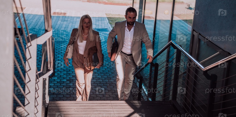 Современная деловая пара после долгого рабочего дня вместе направляется к своему уютному дому, воплощая идеальное сочетание профессионального успеха и личного удовлетворения