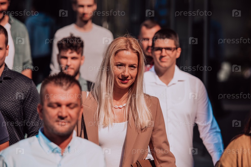 Группа бизнесменов и коллег из разных слоев общества прогуливается по своему рабочему месту, демонстрируя сотрудничество и командную работу в компании