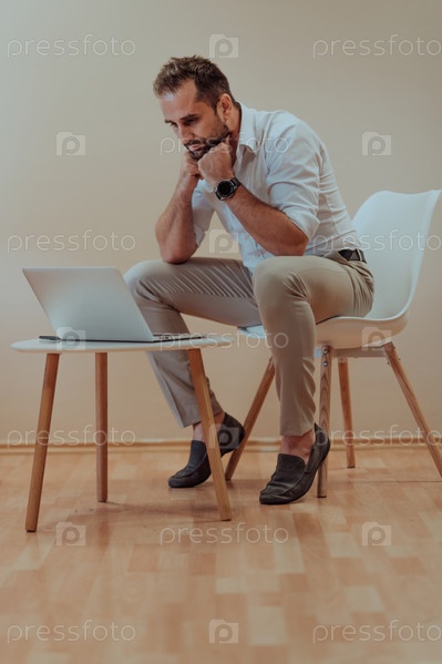 Уверенный в себе бизнесмен сидит и использует ноутбук с решительным выражением лица, а бежевый фон усиливает профессиональную атмосферу, демонстрируя его производительность и опыт
