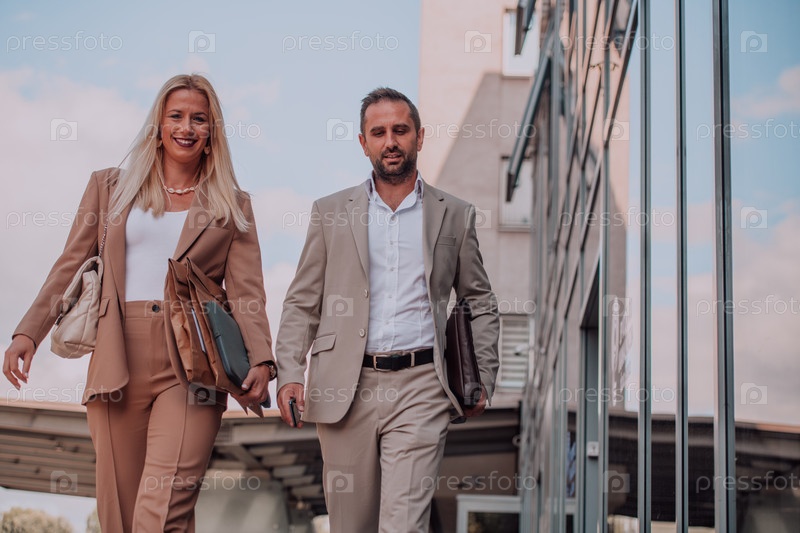 Современная деловая пара после долгого рабочего дня вместе направляется к своему уютному дому, воплощая идеальное сочетание профессионального успеха и личного удовлетворения