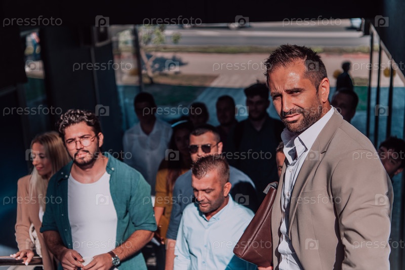 Группа бизнесменов и коллег из разных слоев общества прогуливается по своему рабочему месту, демонстрируя сотрудничество и командную работу в компании