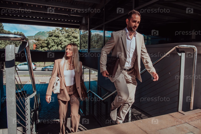 Современная деловая пара после долгого рабочего дня вместе направляется к своему уютному дому, воплощая идеальное сочетание профессионального успеха и личного удовлетворения
