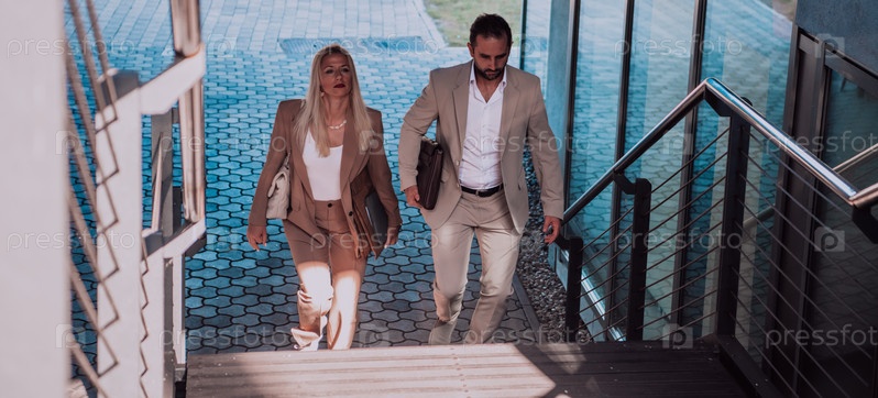 Современная деловая пара после долгого рабочего дня вместе направляется к своему уютному дому, воплощая идеальное сочетание профессионального успеха и личного удовлетворения