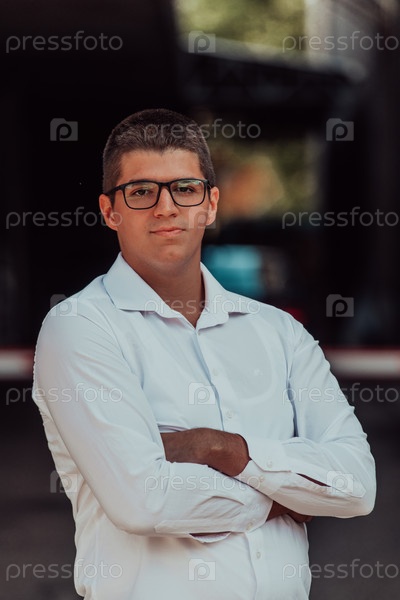 Успешный бизнесмен в белой рубашке, скрестив руки, позирует на открытом воздухе с уверенным выражением лица