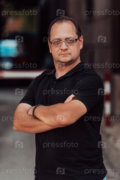Успешный бизнесмен позирует на открытом воздухе, скрестив руки на груди