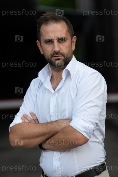 Успешный бизнесмен в белой рубашке, скрестив руки, позирует на открытом воздухе с уверенным выражением лица