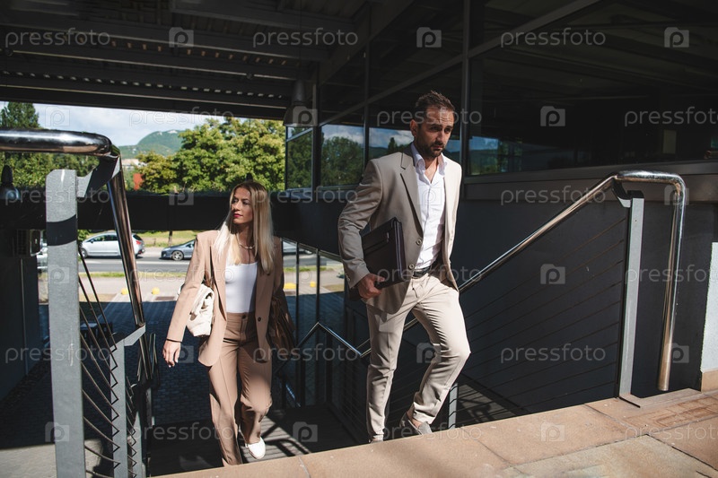 Современная деловая пара после долгого рабочего дня вместе направляется к своему уютному дому, воплощая идеальное сочетание профессионального успеха и личного удовлетворения