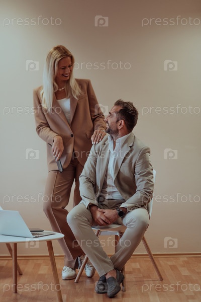 Пара бизнесменов позирует для совместной фотографии на бежевом фоне, запечатлевая свое профессиональное партнерство и создавая вневременной образ единства и успеха