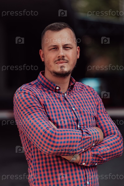 Успешный молодой бизнесмен в рубашке, скрестив руки, позирует на открытом воздухе с уверенным выражением лица