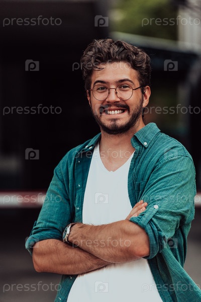 Успешный молодой бизнесмен в рубашке, скрестив руки, позирует на открытом воздухе с уверенным выражением лица