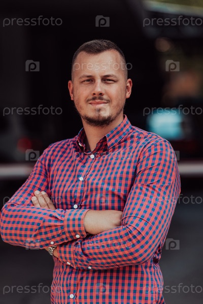 Успешный молодой бизнесмен в рубашке, скрестив руки, позирует на открытом воздухе с уверенным выражением лица