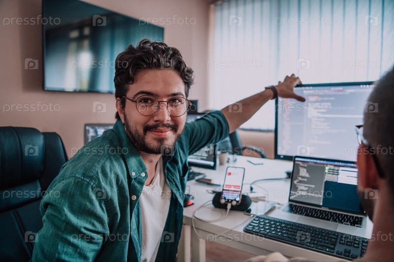 Программисты, погруженные в тесное сотрудничество, усердно трудятся вместе над решением сложных проблем и разработкой инновационных мобильных приложений с безупречной функциональностью