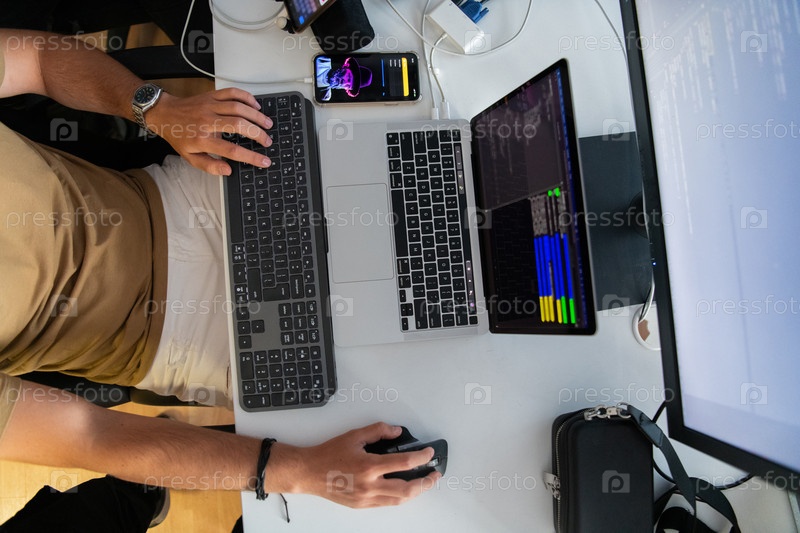 Вид сверху на программиста, усердно тестирующего приложения для смартфонов, сидя в своем офисе
