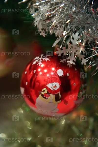 Красный елочный шар со снеговиком на искусственной елке, крупный план