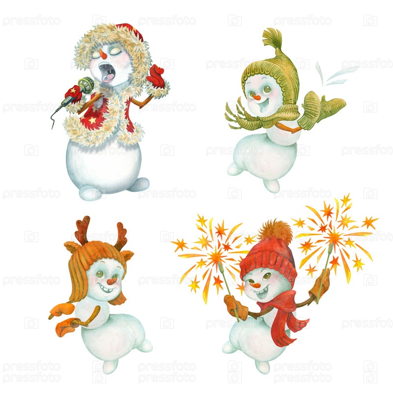 Веселые снеговики. Акварельный набор мультяшных танцующих и поющих снеговиков на белом фоне для оформления зимних праздничных открыток и плакатов, иллюстраций для детских журналов, принтов на футболках или сумках