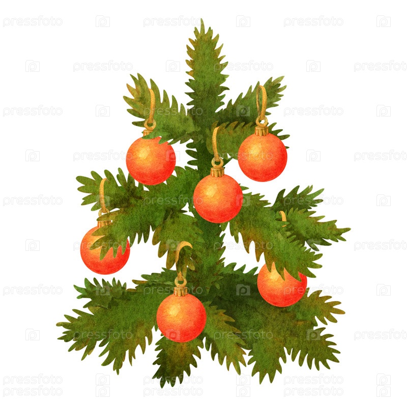 Изолированная акварельная ель или елка, украшенная праздничными шарами. Нарисованное вручную зеленое хвойное дерево для зимнего баннера, открытки, узора или орнамента, для создания сезонного фона или пейзажа