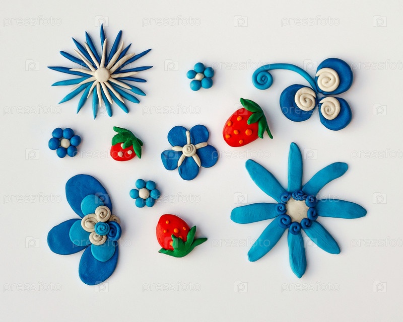Синие, голубые с белым цветы и 3 красные ягоды земляники с зелеными листьями из пластилина на белом фоне. Вид сверху