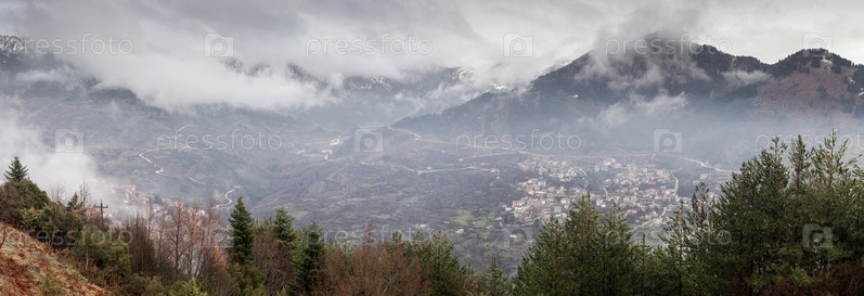 Вид на деревню (Греция, Эпир) и заснеженные горы зимой в пасмурный день