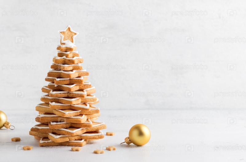 Рождественская елка из домашних имбирных пряников, украшенная сахарной глазурью на светлом фоне, с традиционными рождественскими украшениями