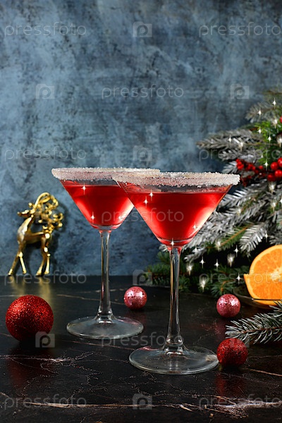 Рождественский алкогольный коктейль мартини в бокалах на праздничном фоне с еловыми ветками и украшениями, концепция бара и канун Нового года, алкогольные напитки на вечеринке, выборочный фокус