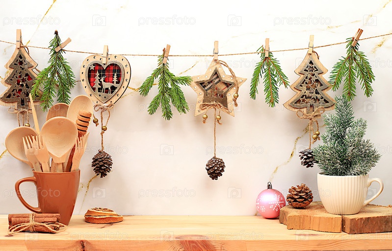 Пустой деревянный стол с рождественскими елками, кухонными принадлежностями и праздничными украшениями на светлом фоне.Рождественский и новогодний макет для дизайна и демонстрации продукта, минимальная концепция Merry Christmas,